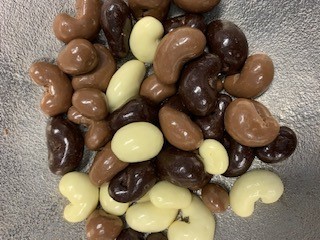 Geröstete Cashewkerne mit Vollmilch- Zartbitter- und weißer Schokolade.