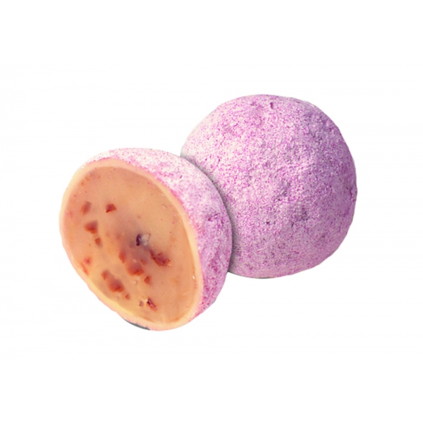 Ingredients: Sugar, Cocoa Butter, Cream, Whole Milk Powder, Humectant: Sorbitols (E420); Glucose Syrup, Butter, Grappa (4%), Dried Rose Petals (0,3%), Blueberry Powder [Blueberries, Maltodextrin], Emulsifier: Lecithins [Soy] (E322); Natural Rose Flavour, Vanilla Extract, Natural Vanilla Flavour.